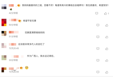 得知黄婉秋病重的消息后,无数网友都为她加油打气,希望她能挺过难关,“希望黄老师能战胜病魔,继续传唱‘刘三姐’。”